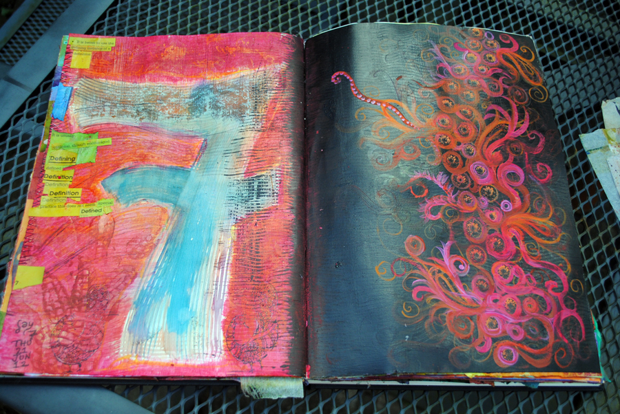 Beginning the page with Black Gesso, some white writing and doodling. Tissue paper for texture.