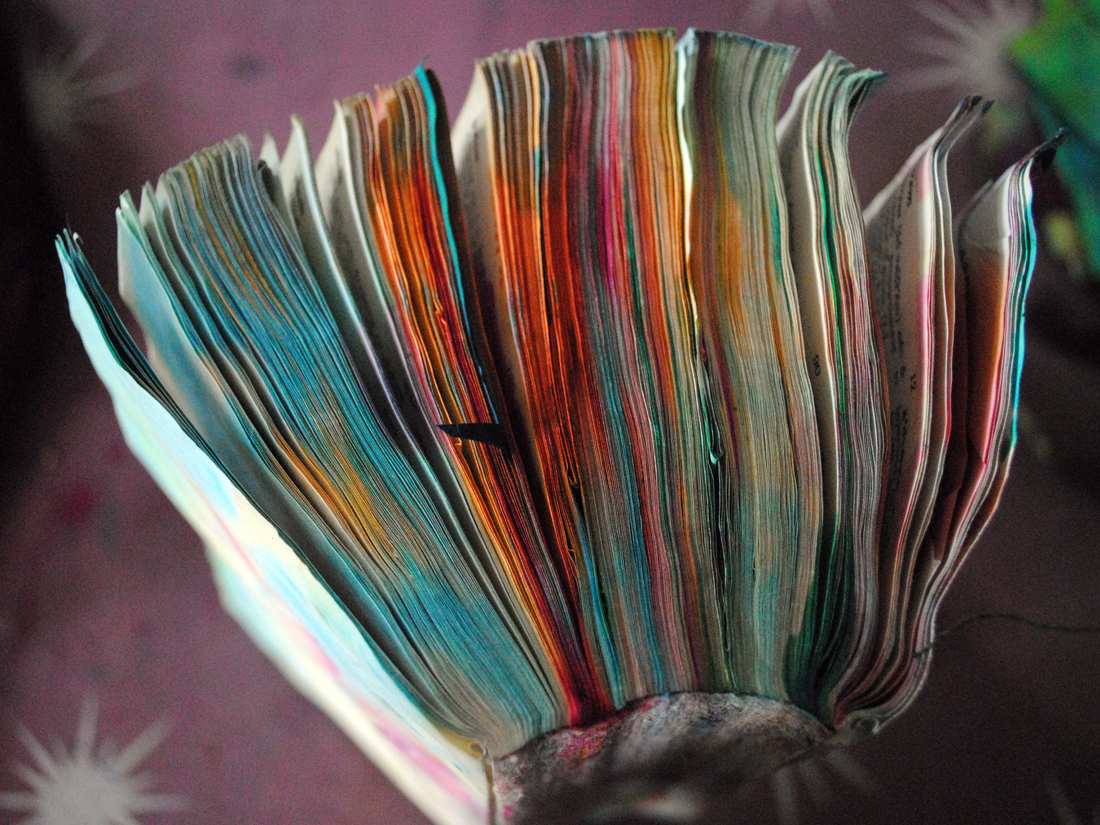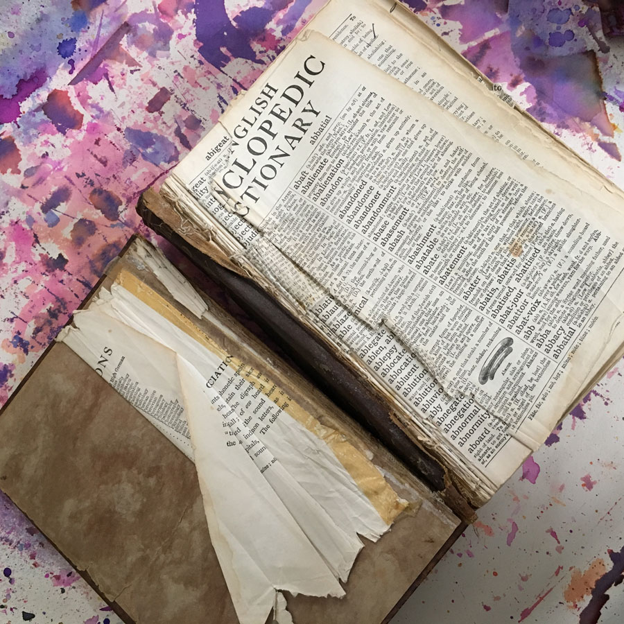 Way back, my first experiments were with an old dictionary. She’d already lost her cover and was very loose at the bindings. She was ready to become art paper.