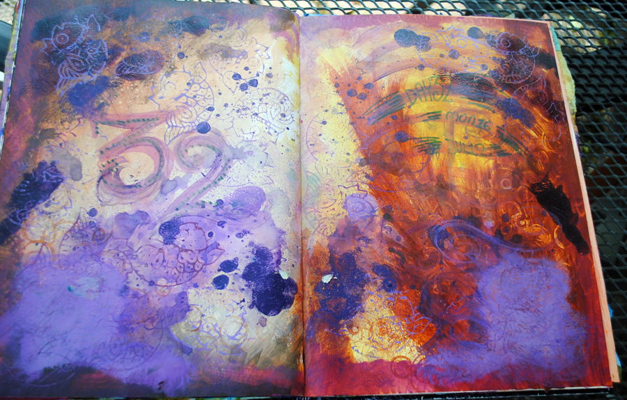 Day 7 was the day I first played with black gesso. Delighted! I was expecting a kinda chalky grey-ish-ness that absolutely isn’t there. My new love in life is gesso. Words can’t express my joy at its cover-up-ability, it’s smooth creamy texture and lush slide-about-the-page-ness it has. YUM. This was the base for the swirls in guache and acrylic.