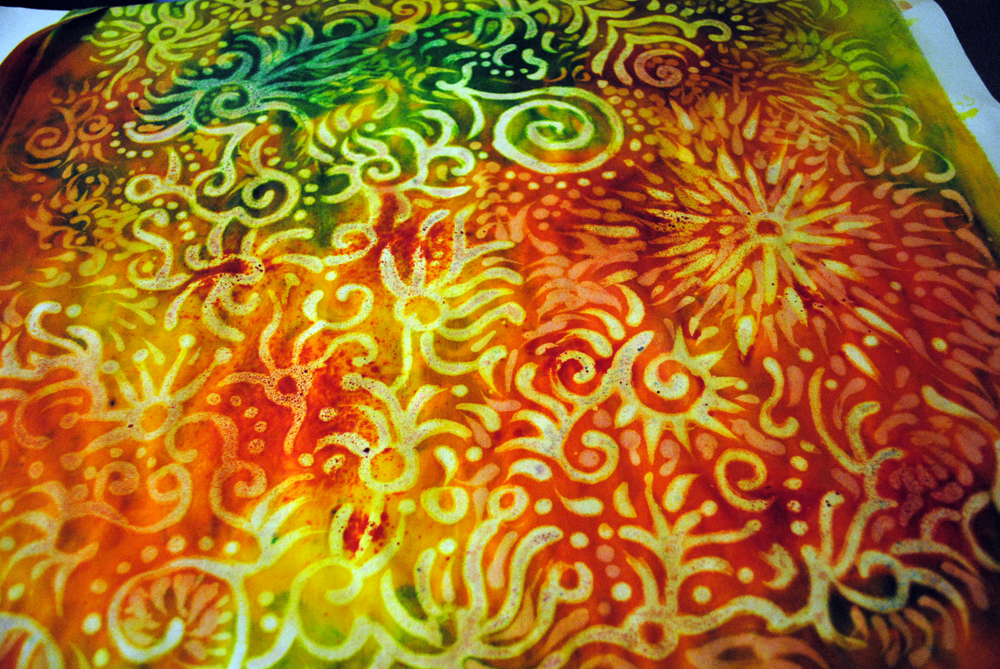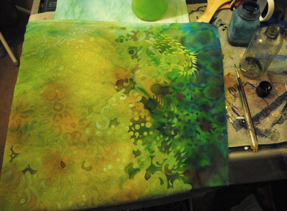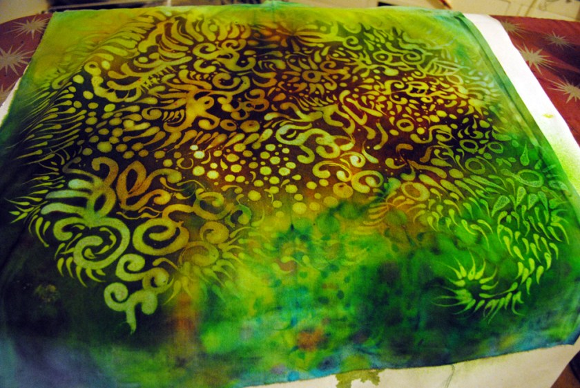 I had planned to paint and drip procion dyes, swish with water, get a nice watercolory-effect then fix with soda ash per dying instructions on the bottle. Building up by layers, some more batik-stuff, more drying-ironing-inking cycle, etc…