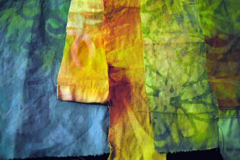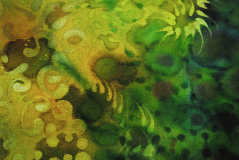 This is the underside of a freshly dye-painted sample. The eagle eyed amongst you might notice the batik-stuff appears speckled. It isn’t. This only happens if you use a fluffy-with-velvet-trimming-fuzz-covered surface to paint on. Oops. No matter, it all comes out in the wash.