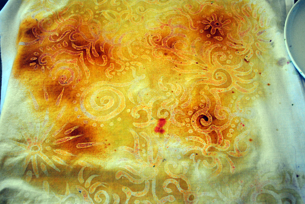 With the consistency of cream (shake well – I forgot one time and it does separate unshaken), it paints on nicely. I was using cotton sheeting, and found it absorbed and spread, so even the finest lines came out a bit chunky. In that sense it’s limited in comparison to real batik, but something to build into the design I guess. The other main difference is that unlike batik wax it is flexible when it’s dry, so none of that lovely crackle effect. But other fabrics need testing on!