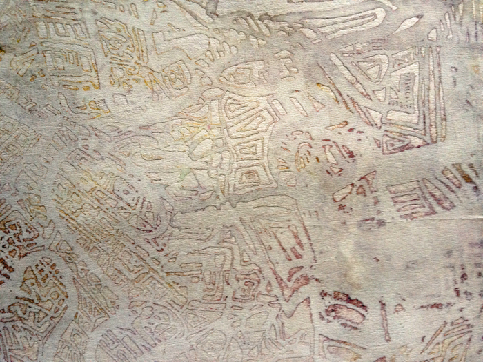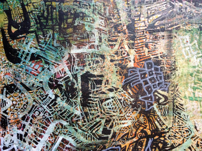 Then there’s the masking off areas with torn paper, and going back to doodle in the gaps. Some overprinting and joining the overprints in the same way