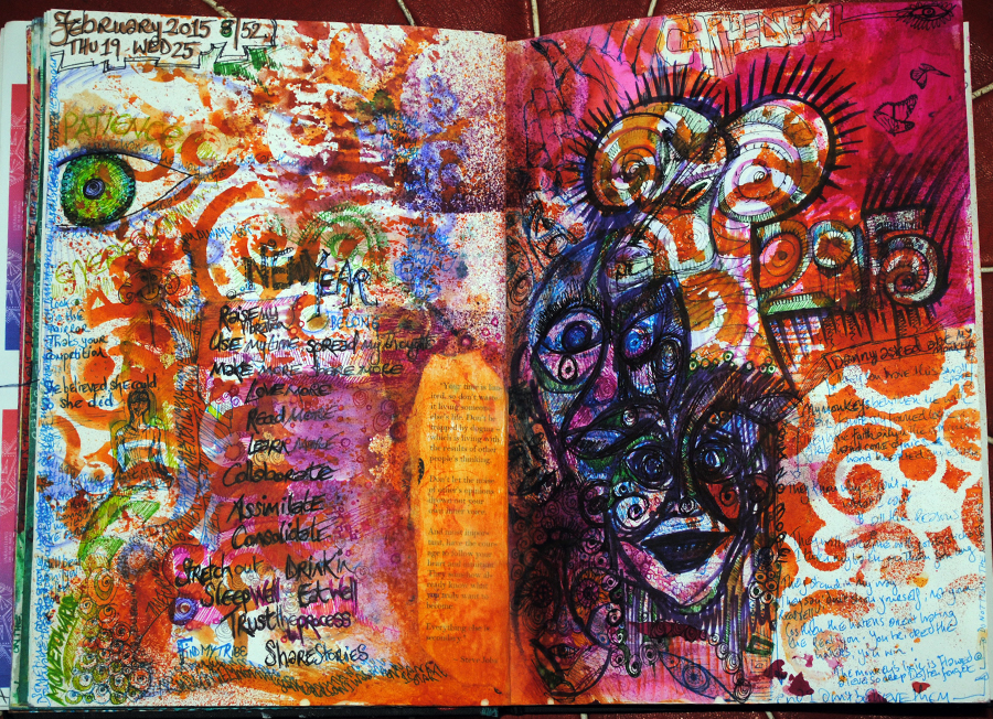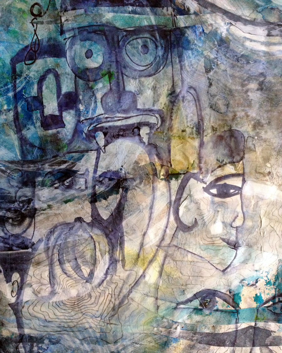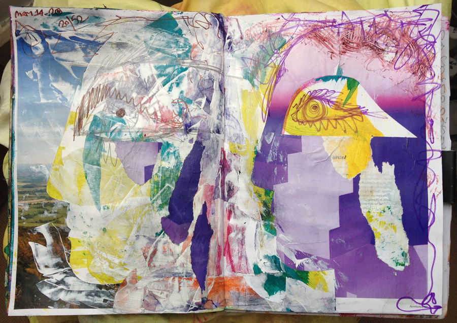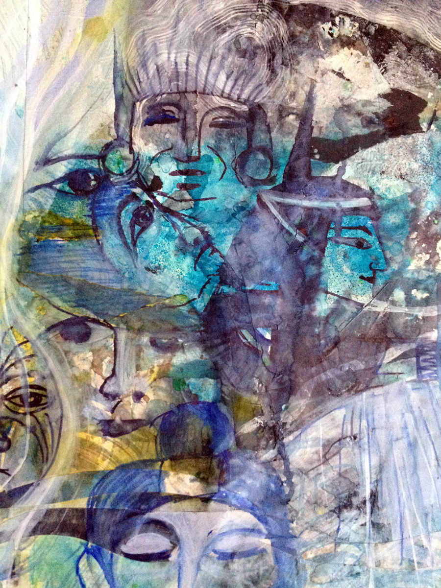 Since I spent a weekend in conversation with my daemons, they’ve been magicking themselves into apparency here,there & all over. This week they’ve manifested in a semi-Cubist, heavy handed biro scrawl, merged, their tribal Día de Muertos faces peering out from the recesses of the page.