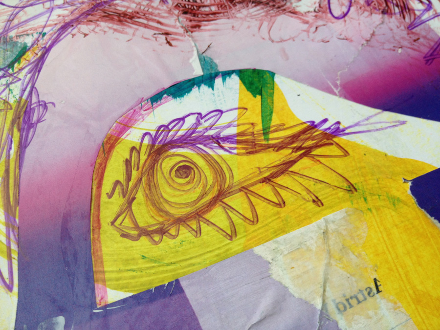 And another familar trick: glue in a load of the offcuts of paper that are littering the work table. Much of this was soon to be lost under layers of heavy paint. But that’s the nature of the ephemeral.