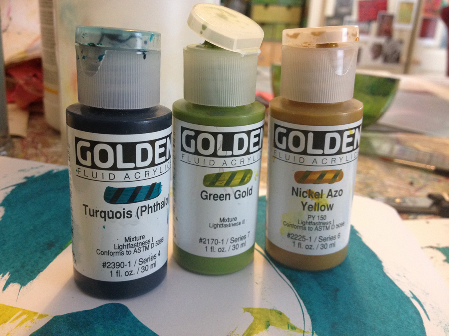 Mmmmm yummy Golden fluid acrylics: I have like about 5-6 of these weeny little bottles. They are expensive, but they are so lush. Delicious. Mmmmmm…. And just a few little drops scrape out soooo much colour: