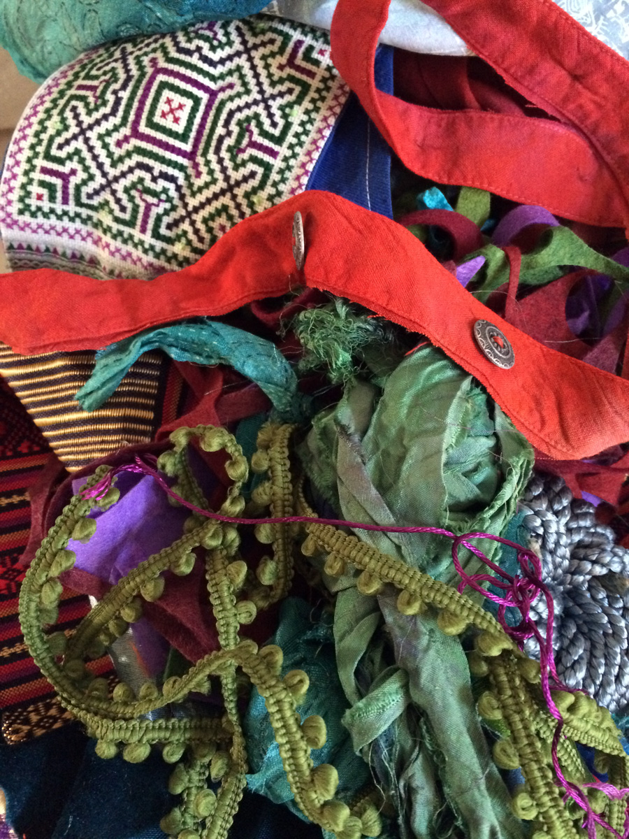 Clothing that’s not quite wearable any more, fabric scraps and snippets, material I’ve dyed, painted, embroidered, cut up and sewn up and all the projects and garments that haven’t quite made it, that haven’t quite played out, but they’re still lingering. Then there’s the trimmings and buttons and beads, the threads, the wools, the fibres….