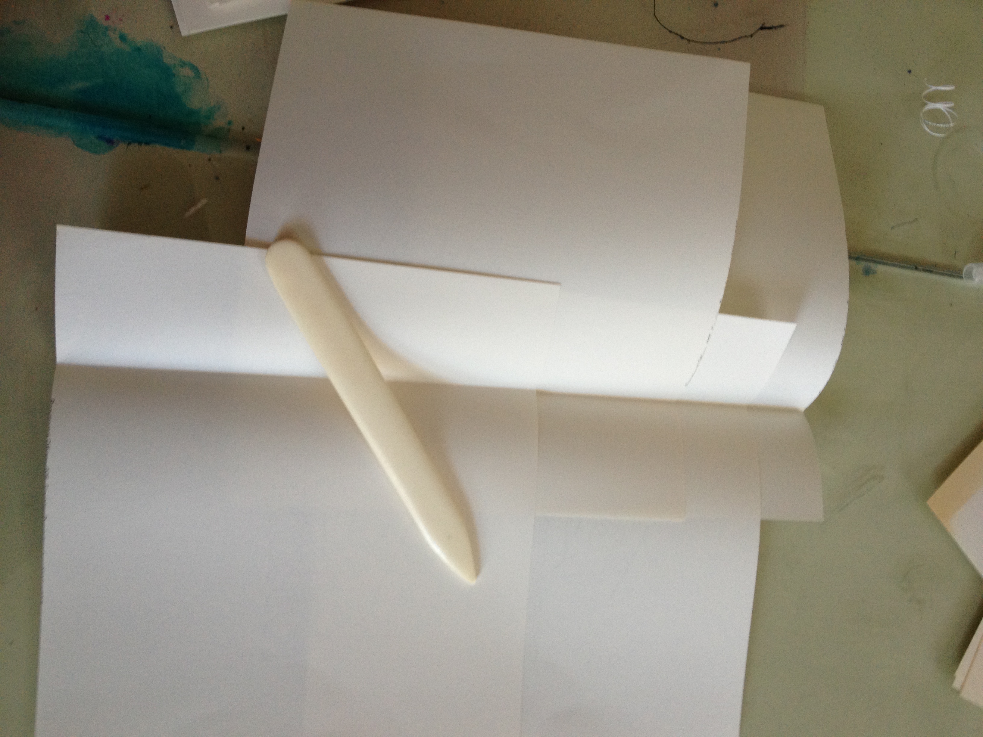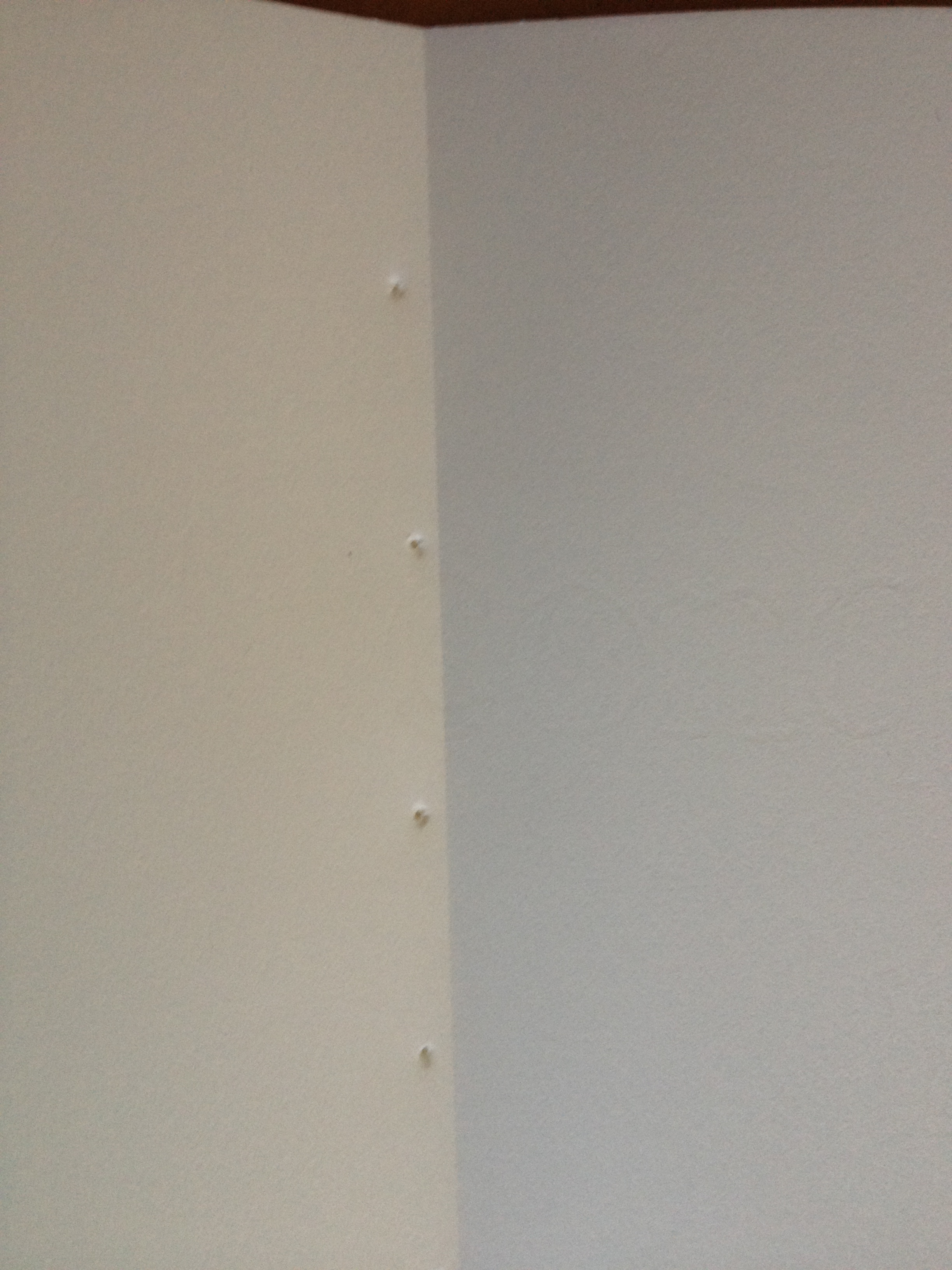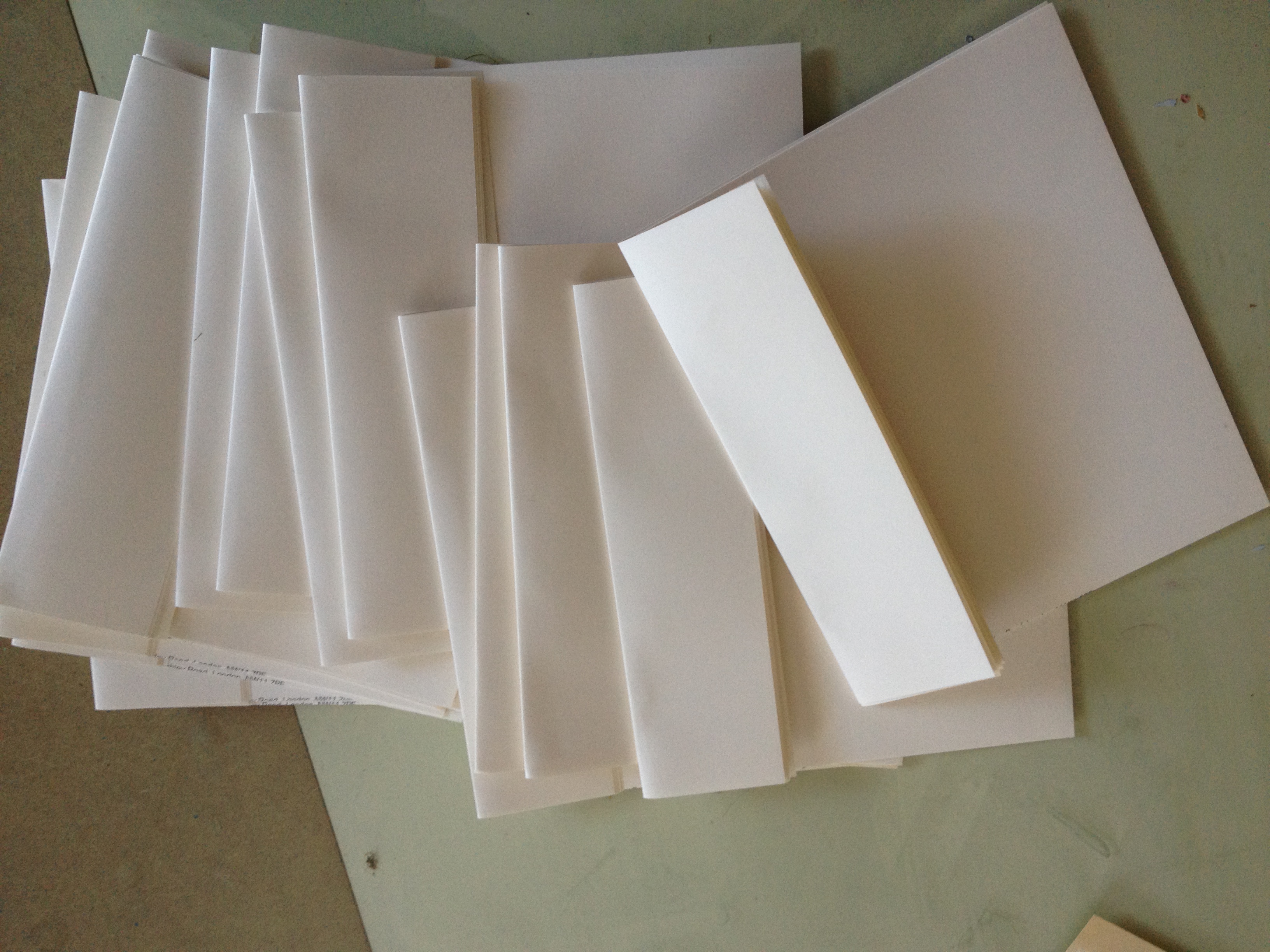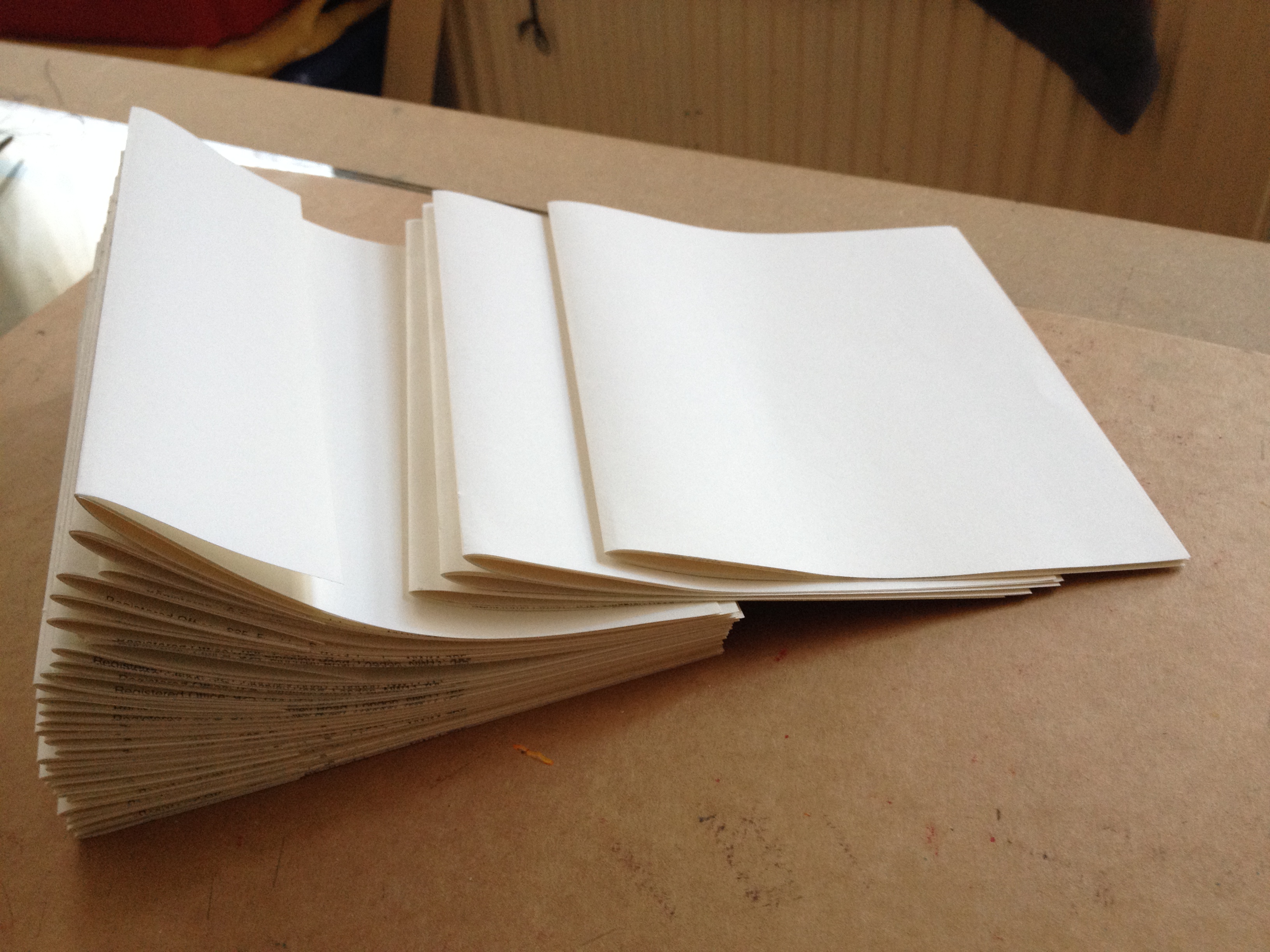 This fitted with the predicament of using recycled letterheads: once the letterheaded part was sliced off, the resulting folded in half size makes for fairly small pages. Not so compatible with big loopy writing that makes up words who need space to play in. So here comes the multipurpose wide page/thin page idea!