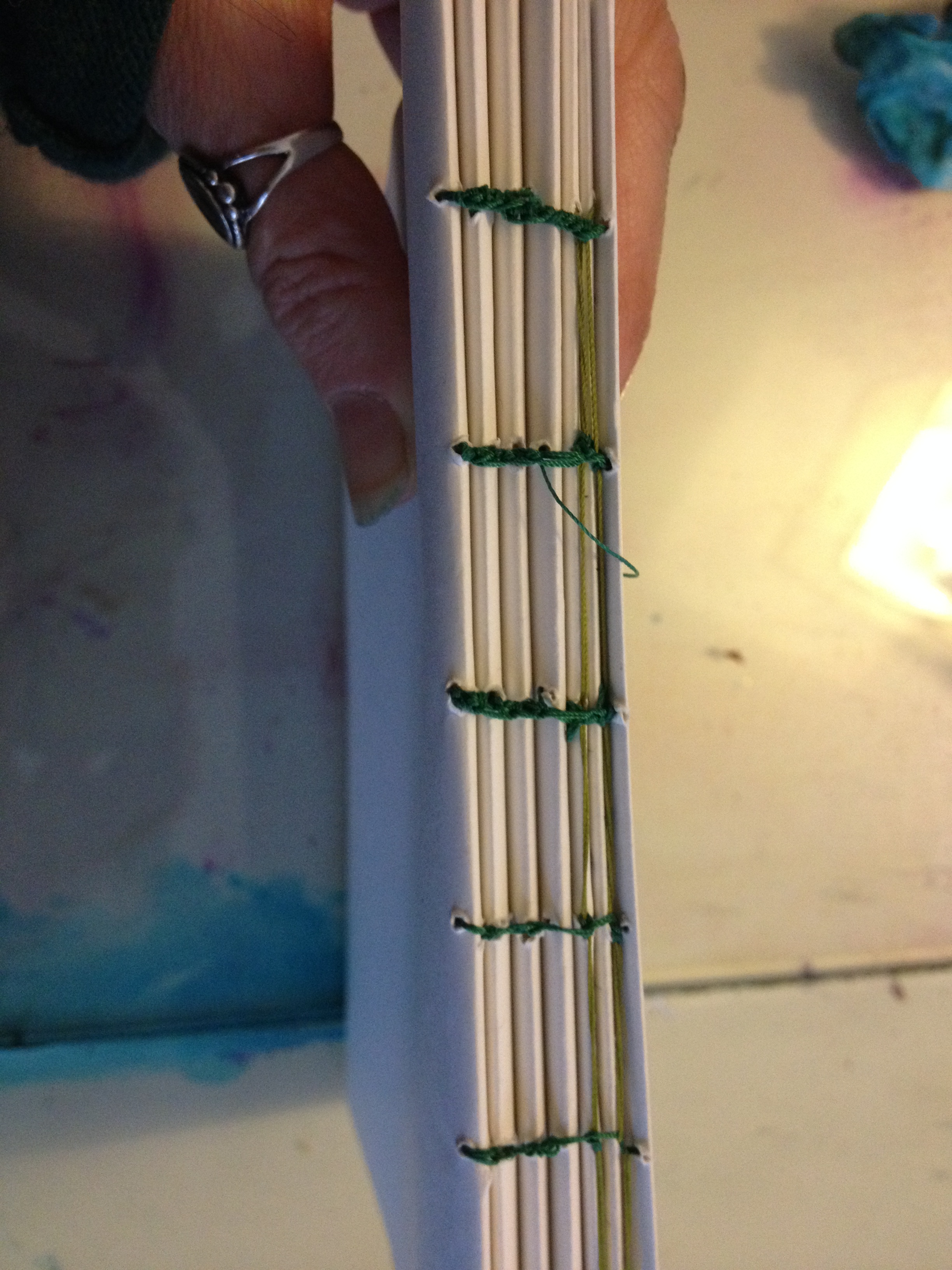 The actual binding part (this is Coptic, but there are numerous ways to string a book here). My teacher is Sea Lemon. She is very neat and precise and I am not, so please don’t judge her instruction by my results! I looked at a few how to videos and found hers the simplest to follow. Then went ahead, broke all the rules, and did my own thing loosely based on this technique. People fall into two camps: those who embrace the slapdash yet sturdy approach and those who wince at the evidently hand cobbled outcome. If you fall into the latter camp, brace yourself, or click away now.