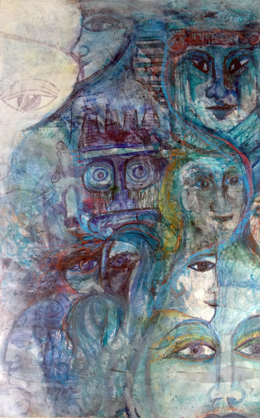 The ongoing story of the two paintings about Water bumbles on… collage on top of painting on top of collage.