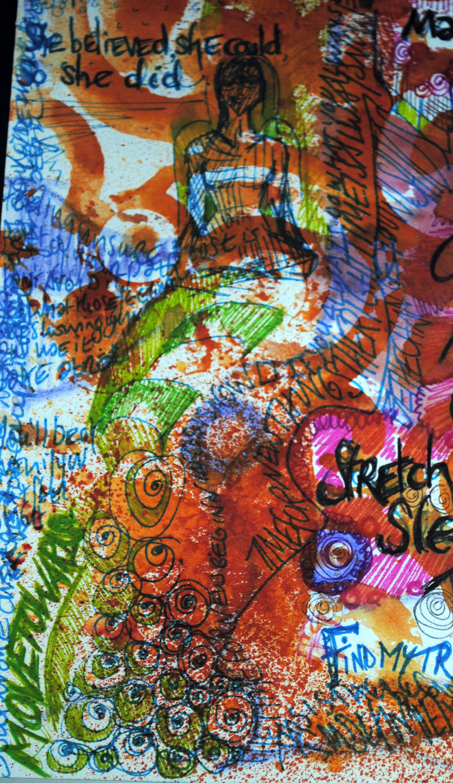 And it must be the most colourful yet. It’s also the most full of subconscious tells – I’m only starting seeing now I look back from a few days later. Like the green mermaid/peacock – I didn’t draw her but she emerged from a funny little cross-leggedy figure and the phrase ‘move toward’ and some doodles.