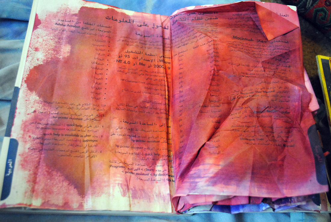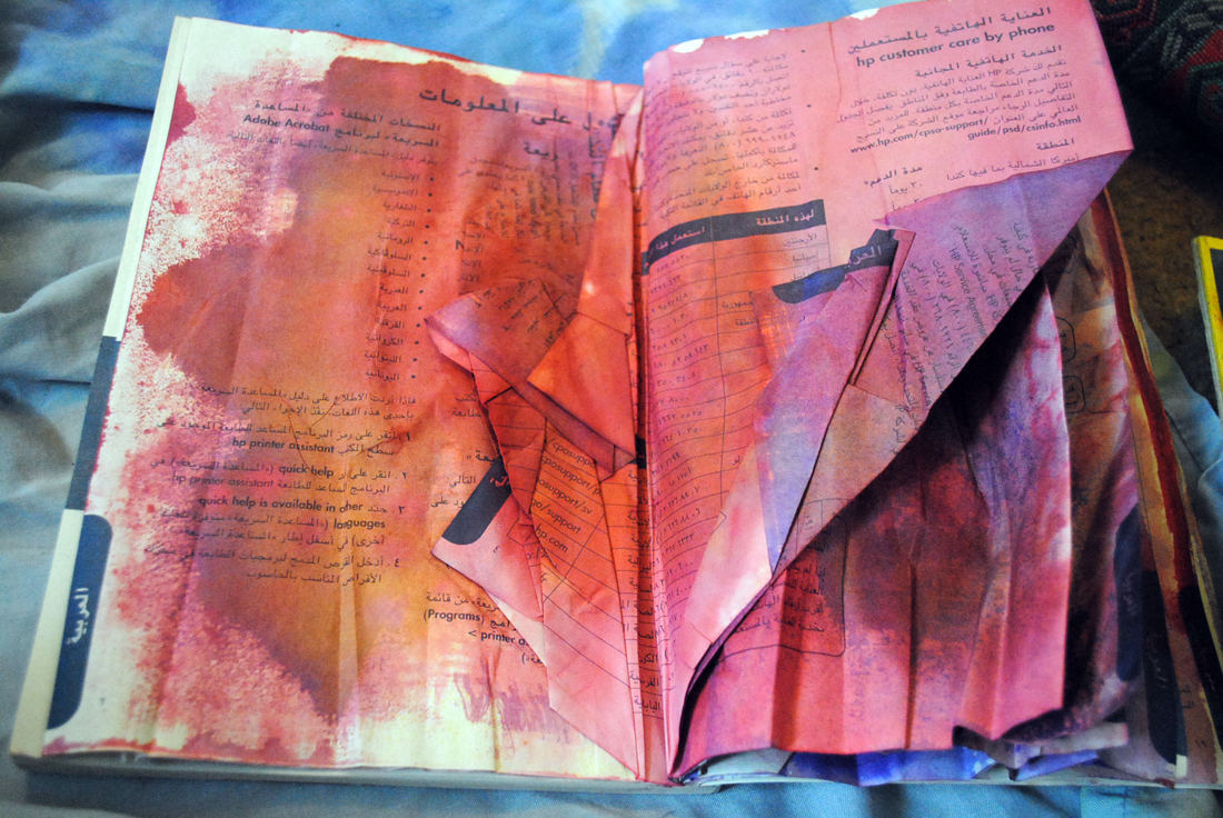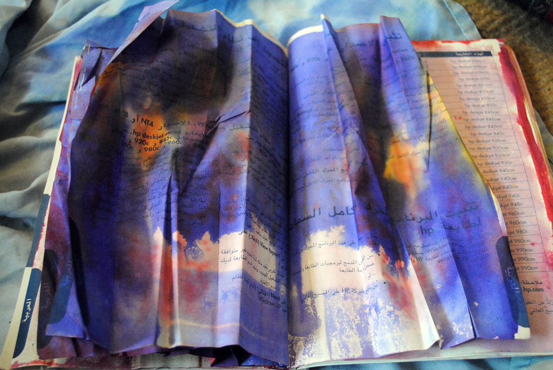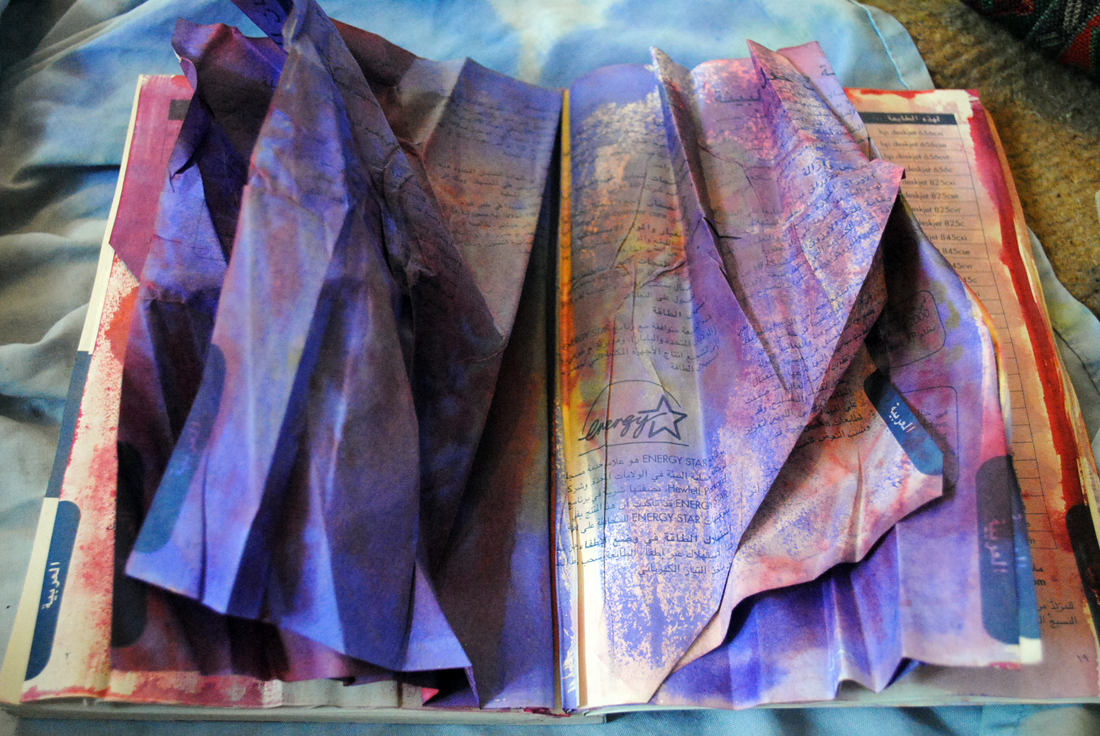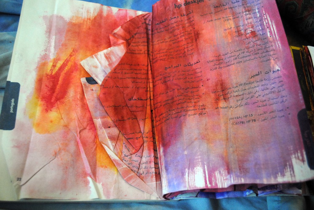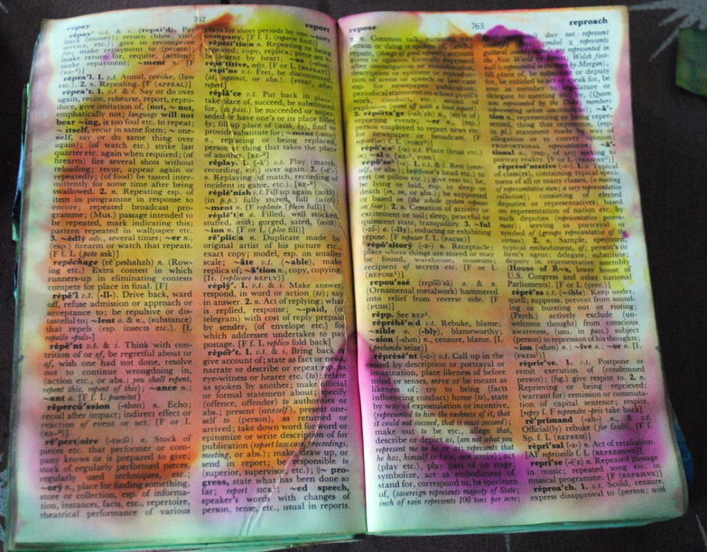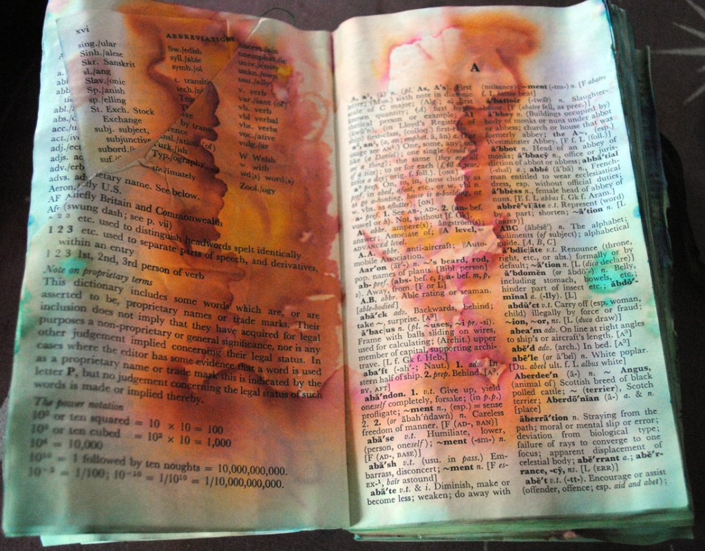 Way back, my first experiments were with an old dictionary. She’d already lost her cover and was very loose at the bindings. She was ready to become art paper.