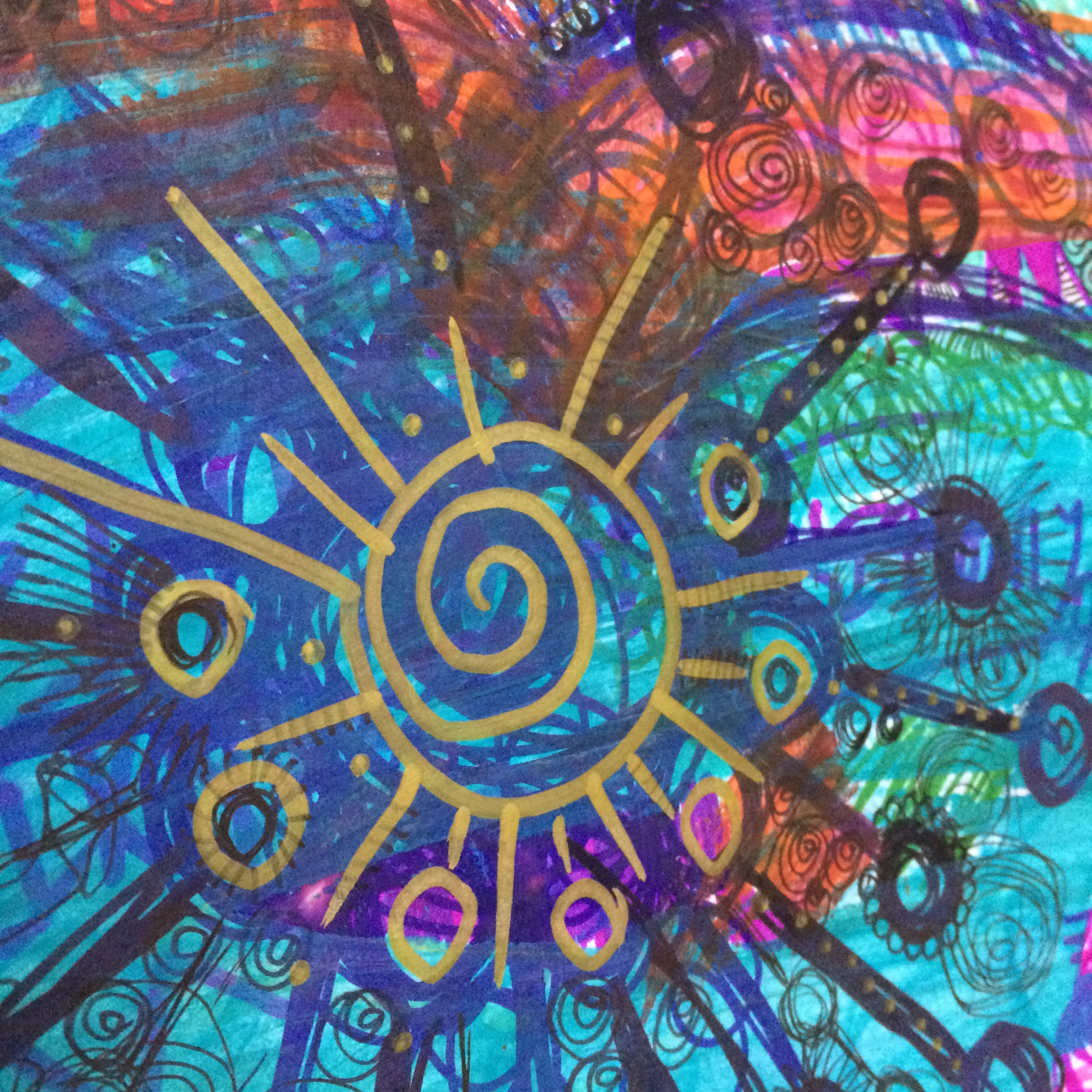 Like the proverbial kid in the sweet shop, or the bull in the china shop, I am the loon with the oil pastels, making the lumps and rhythms in the white paint come to life in all the colours of autumn that my eyes have been unconsciously soaking in.