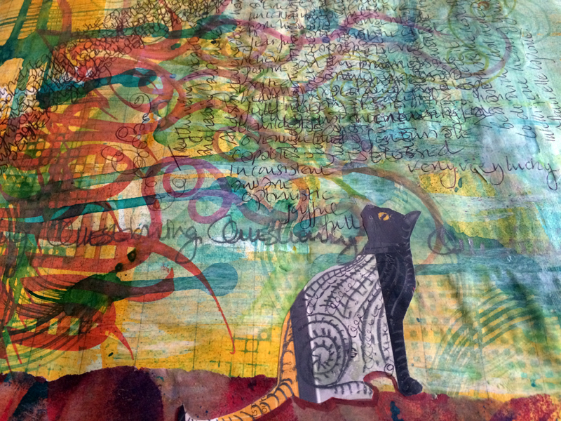 There’s a lot about contrast. By which I mean to say – everywhere – it’s all about contrast, isn’t it? And on a smaller scale too.. Yester-page saw the words shouting out unhindered by art. This page is the opposite as from almost the outset the wordage got drowned out by heavy paint.