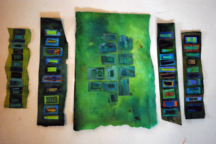 It lends itself so well to roughly torn edgery, and as I discovered this week, tearing it when wet makes for even fluffier edges. Now I don’t remember what this paper is made from, it’s (I beleive) Indian and has super-long fibres. I painted it with Koh-I-Noor dye paints then gently tore it while it was still soggy.