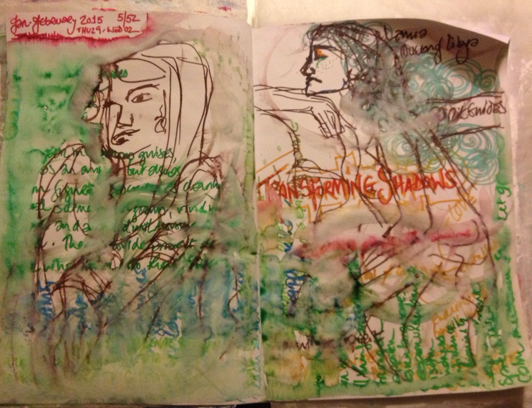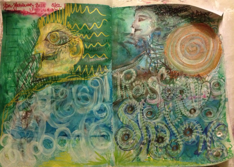 Since I spent a weekend in conversation with my daemons, they’ve been magicking themselves into apparency here, there & all over. This week they’ve manifested in a semi-Cubist, heavy handed biro scrawl, merged, their tribal Día de Muertos faces peering out from the recesses of the page.